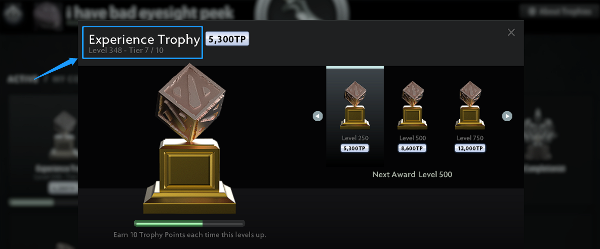 <figure><img src="https://4001285727-files.gitbook.io/~/files/v0/b/gitbook-x-prod.appspot.com/o/spaces%2FSHKauKo27VugKuWMdsdh%2Fuploads%2FFcOqKIDX32rEtE5PsIyj%2Fimage.png?alt=media&#x26;token=3032e98e-d8bc-424a-a229-a0661a2e8f7d" alt=""><figcaption><p>Dota 2 Experience Trophy</p></figcaption></figure>