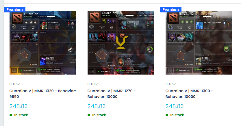 <figure><img src="https://4001285727-files.gitbook.io/~/files/v0/b/gitbook-x-prod.appspot.com/o/spaces%2FSHKauKo27VugKuWMdsdh%2Fuploads%2FbDaglId4hjR0TomFrzGa%2Fdaacc8629262fd466a6b82824c4a039.png?alt=media&#x26;token=aaf5585c-9645-48ab-8aa3-dc83fcd218d9" alt=""><figcaption><p>Dota 2 Premium Accounts</p></figcaption></figure>